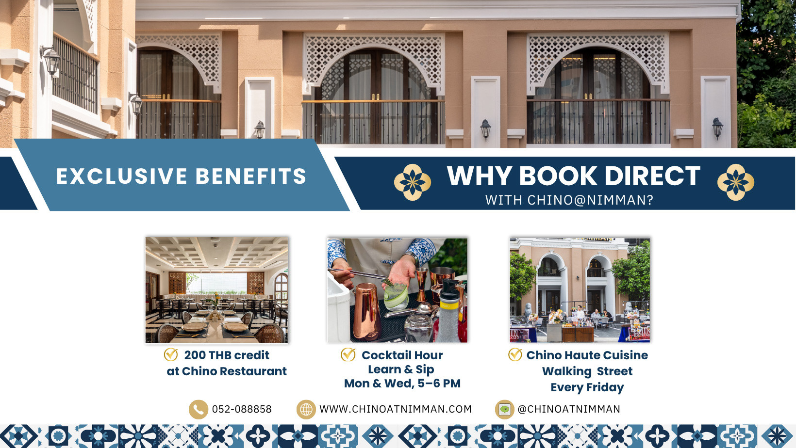 เพลิดเพลินกับทุกช่วงเวลาแห่งความสุขสำราญ เชิญมาพักผ่อนหย่อนใจแบบไร้กังวลพร้อมเก็บเกี่ยวความประทับใจอย่างมิรู้ลืมที่โรงแรมชิโนแอทนิมมานลักซัวรี่บูทีคโฮเทล